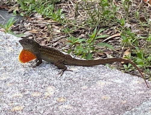 Insects and lizards actually enjoyed the astonishing heat wave of last month. The lizard population has grown exponentially — this week there is a whole new crop of baby anoles (or chameleons), both green and brown. The brown anoles, or Cuban anoles, are a non-native species introduced from the Caribbean. While there is some controversy about their presence in our landscapes, the two species seem to co-exist. At least there are both in my garden. Both are insect predators, and each species seems to stick to a territory or a layer.