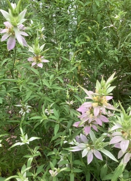 And then, there’s the horsemint! I love horsemint, and it attracts many pollinators. Horsemint is a native species of bee balm (Monarda punctata) with “stacked” flowers of lavender and pink, off-white with a few dots. The colors are subtle, but the “show” of busy insects is amazing! However, horsemint re-seeds with abandon! I have pulled up many horsemint plants this year, but you would never know it to look at my yard. My mission now is to let the pollinators collect all the nectar from the flowers, then I will pull the majority of the plants before they set seed. I have a feeling I have already lost this challenge.
