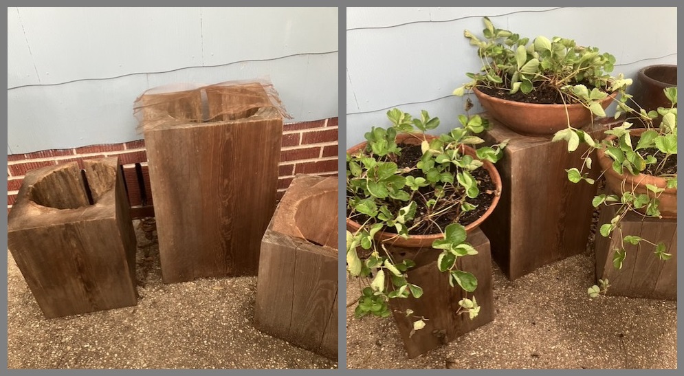 I recently bought three unique plant stands at a neighborhood garage sale. These plant stands were made in Japan to display bonsai specimens. They were brought to Pensacola by former Naval officers, and now reside in my yard. I have the perfect use for them! My strawberry plants are always trying to escape from their raised bed. Actually, that is a good thing — the “escapees’ are new plants sent out from the parent as “runners”. These plant stands will allow the runners to trail downward. I love the look of that, but it has a practical purpose too. Strawberries are beloved by slugs. But slugs don’t like to cross metal screen with the metal strands exposed. I understand that they are particularly sensitive to copper screen, because the copper produces a tiny current. I can put metal screening underneath the planter and the pot. I will let you know if this plan works to keep slugs away. I have the feeling that whether or not this anti-slug plan works, the birds will be feasting!