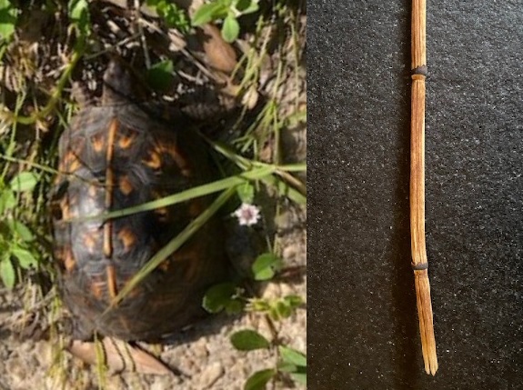 Not long ago, I came across that same pattern on the shell of a young box turtle in my yard. The “spine” of the shell has an ochre stripe with black “dashes” in regular intervals. It perfectly mimicked the dried horsetail rush in my sitting room. The patterns on the other scutes looked like stylized artwork — simplified patterns like a beautiful batik fabric. Other ochre markings on the dark brown of the shell make it look like it is lit from within.