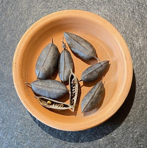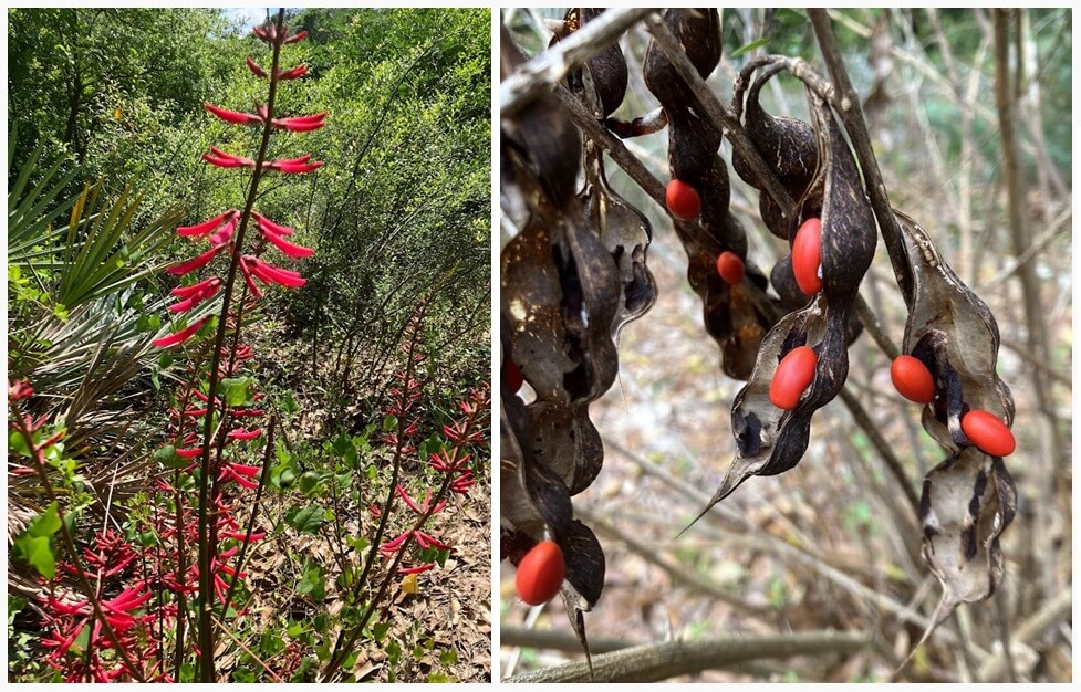 Coral bean grows in a wide range of conditions, even on the beach. The leaves have a triangular shape. The stems have small thorns, so they should be planted away from paths. The red seeds in the black pods are eye-catching! The coral bean seeds are poisonous, like many other red seeds. Bright red is nature’s warning signal! Many red seeds (including coral bean) must be scratched or scarified to germinate. (So, just scratch them, don’t eat them!!)