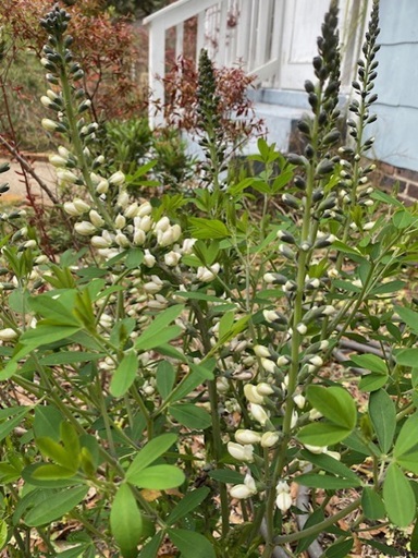 Spring is springing everywhere in my garden! The white baptisia is sending up strong shoots with many white buds at the tips. If you haven’t grown this beautiful native perennial, try it out! The thick stems emerge from a woody root, and in a short period of time, the baptisia grows to about 2’ high and 2’ wide with many showy white flowers. Bumble bees are the main pollinators. Once the blooms have been pollinated, fat black seed pods decorate the plant. These hard seed pods are like rattles, and persist for most of the summer.