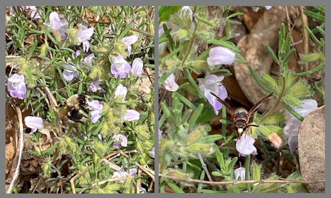 Right now, in this wooded area, the pawpaw is covered with buds (host plant for zebra swallowtail); both the sassafras and the spice bush are leafing out (hosts for spice bush swallowtails); several species of native blueberries (sparkle berry, Darrow’s blueberry, Elliott’s blueberry, and edible blueberries) are blooming and covered with buzzing Southeastern blueberry bees — as is the conradina; Native azaleas are blooming and budding and so are buckeyes. And there is more to come!
