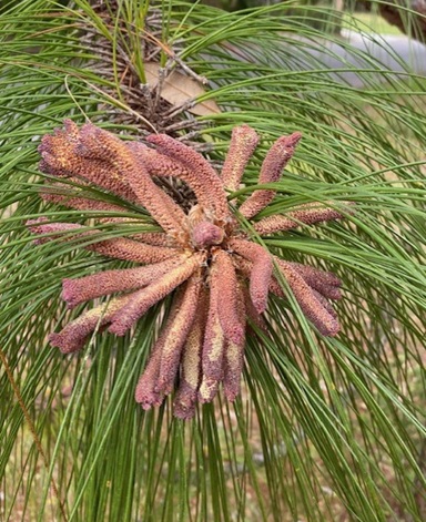 “Bev” (my lovely longleaf pine) grows in the wooded area. She produced her first pinecone last year. This year she is absolutely covered with “blooms” — waxy. weird cylinder-shaped clusters that contain masses of pine pollen! Pines and oaks are wind pollinated — the wind blows the pollen from one tree to another.