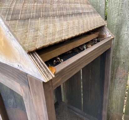 The wrens are also very vocal, especially when we venture close to a nest. And they nest in very strange places! I found the beginnings of a nest in the large butterfly box — a slat had come off the roof and the wrens moved into the space. They have abandoned the nest now, probably because we are checking the boxes on a regular basis for newly hatched butterflies. Even wrens can get tired of constant stress.