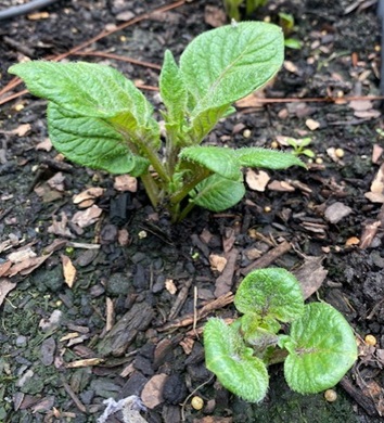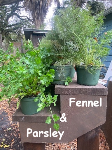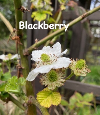 I am trying a new “combo” in pots in my garden this year. I’ve been growing thornless blackberries for several years. Even though I have grown them in a container, the root system escapes and “pops op” suckers. This year I have potted several of the blackberry suckers and added strawberry plants at the base. I put the pots on either side of the paths through the raised beds of the veggie garden. Blackberry plants can reach a height of 6”, so they should make an arbor over the path entrance. My blueberry bushes are just on the other side of the path. I hope to have a productive “berry patch” this summer!