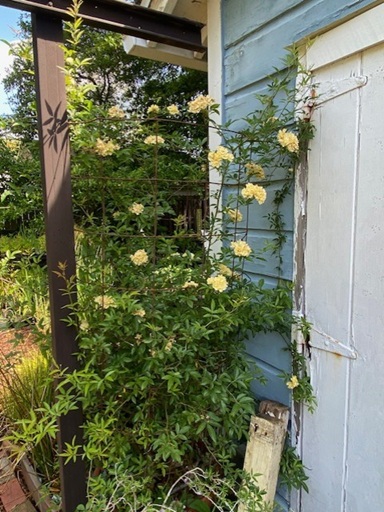 The other “climber” that is showing off right now is the “Lady Banks Rose” (Rosa banksiae). This old rose has been used in gardens for centuries. It is a climber for sure— A Lady Banks can grow to the top of a pine tree. The clusters of yellow blooms are in full glory right now, and best of all, this climbing rose is thornless! If you have an arbor or fence that needs a climber, (and a pair of clippers for a once-a-year trim), Lady Banks might just be the plant for you!