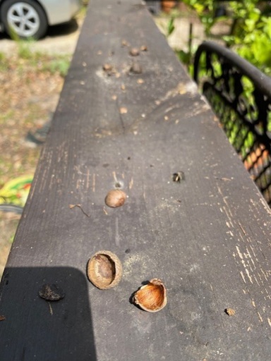 There is a very “cheeky” squirrel that frequents the pond area, too. He comes to get a drink of water and stays to play. He sorts through the acorns on the ground to select a snack. Then he makes himself at home on my chair, the fence, or the steps of the house to eat his snack, leaving the shells behind. It seems like he has taken ownership of the small fenced area, fussing at any animal or person who happens by.