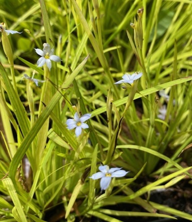 Blue-eyed grass (Sisyrinchium angustifolium) is evergreen, and has the short, grassy foliage that the name implies. Right now blue-eyed grass is lining the ditches and wet spots with blue flowers. It likes a moist partly-shady soil, but tolerates drier sunnier sites. The grassy foliage is more yellow in the sunny spots. Pickerel Weed (Pontederiacordata) is an aquatic native plant with lovely blue spike flowers — even our streams and ponds have the “blues”.