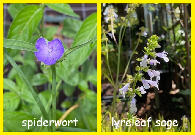 Blue Stars have a lovely blue star-shaped flowers on clusters of straight stems. These beautiful plants are usually found at woods edge in the wild, so they tolerate a good bit of dry shade. Lyre leaf sage will also grow in sun or shade. This native salvia attracts pollinators, and birds use the seeds. It’s fun to watch a bird grasp on to a stem of lyre leaf sage and shake it, then gather the fallen seeds from the ground.