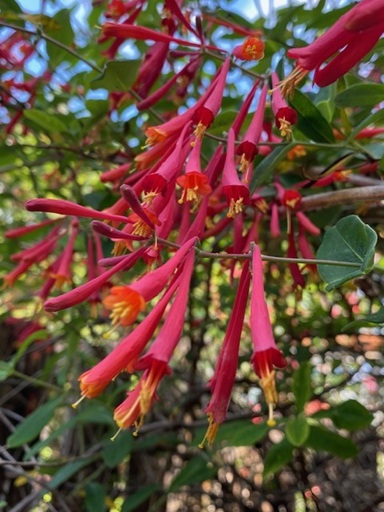 There are some vines I heartily recommend — especially the native coral honeysuckle (Lomicers sempervirens). This is an evergreen native vine that stays in one place! Coral honeysuckle is in full and fantastic bloom right now! I have both a red one and a yellow one, and both are at peak bloom right now. Since these vines are evergreen and stay in place, they are excellent to use in landscapes where a sometimes-tall but not bulky plant is needed.