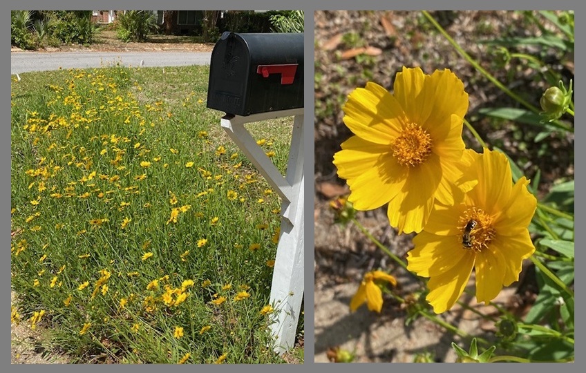 The patch of coreopsis (Coreopsis lancealota) growing along the roadside in the front is a patch so bright yellow right now that it can’t be missed! Several species of coreopsis are native to Florida, but this is our state wildflower, with bright daisy-shaped blooms. Coreopsis is evergreen and sometimes blooms in the fall, too. Coreopsis grows in well-drained soil, often growing on the beach. This plant also tolerates some shade, although the blooms are not so plentiful.