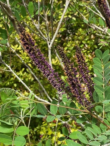 The False Indigo (Amorpha ifruiticosa) s blooming now. Sometimes called “bastard Indigo”, this tall (6-12 feet) deciduous shrub has unusual spiky blooms up to 8” long, burgundy with bright orange stamens. False indigo is useful medicinally, and sometimes used as a dye plant. It also hosts three species of butterflies: Southern dog-face, gray hairstreak, and silver spotted skipper.