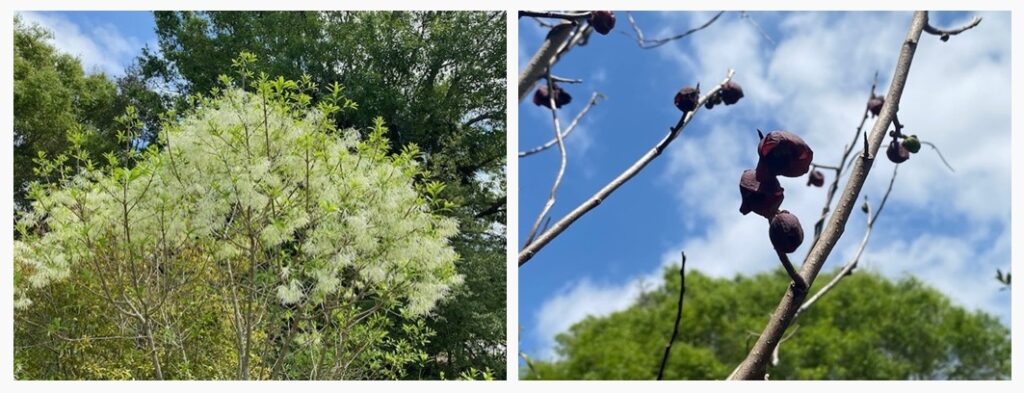 Florida anise (Illicium floridanum) is also blooming with its beautiful burgundy star-shaped bloom. This beautiful native shrub appreciates the shade. It can grow 10’-12’ tall, and makes an excellent screening shrub. Fair warning: the foliage scent is delightful, but the flowers stink!